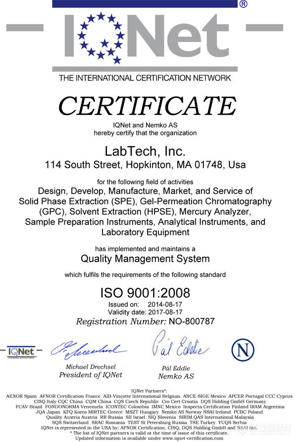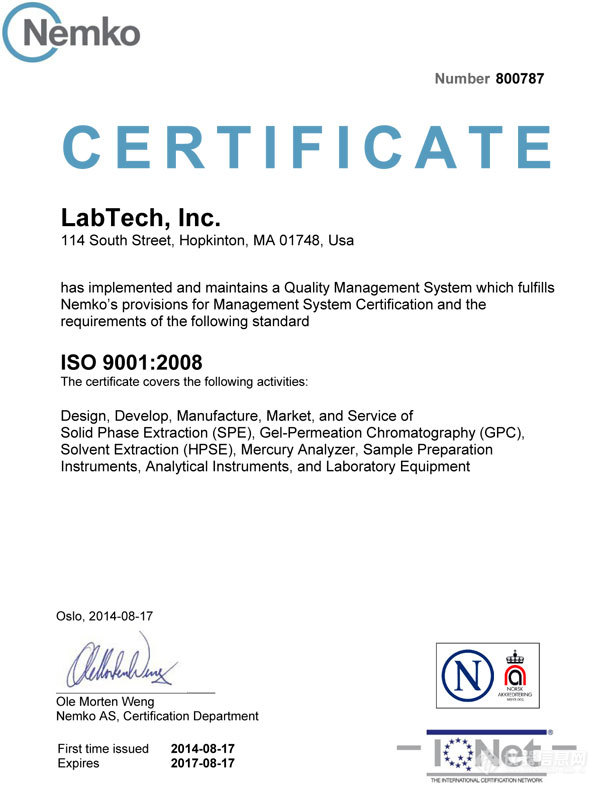 莱伯泰科美国公司经过两年的踏踏实实的ISO运行,于今年6月17日申请了ISO-9001外部审核,美国审核公司IQNet和Nemko经过两个月的审核和评估,于 2014年8月17日共同授予LabTech, Inc ISO9001:2008证书,有效期至2017年8月17日。这标志着莱伯泰科的美国制造产品将在更加严格的质量体系中开发和生产。脚踏实地一步一个脚印地完善和扩展美国研发生产基地是近几年莱伯泰科的一个重要战略目标。目前,莱伯泰科美国公司有三条主生产线:GPC凝胶系列以GVS为主;萃取系列以Sepaths、Sepline、HPSE为主;以及自动进样器、酸纯化等辅助产品系列,今后三年莱伯泰科美国计划将增加更多系列产品的研发生产。本次新标准ISO9001:2008的执行,为莱伯泰科的未来发展提供了更高的质量要求和保证。莱伯泰科将严格按照新的质控标准执行并立志为全球市场提供高品质的实验室产品。